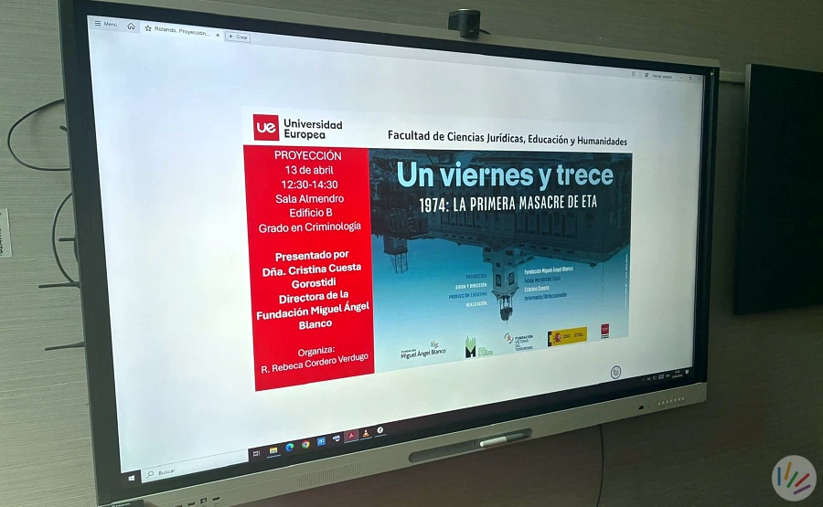 El día 13 de abril Cristina Cuesta impartió una charla educativa y realizó la presentación del documental “Un viernes y trece. 1974: La primera masacre de ETA”, en la Universidad Europea de Madrid, a 75 alumnos de 3º de criminología.